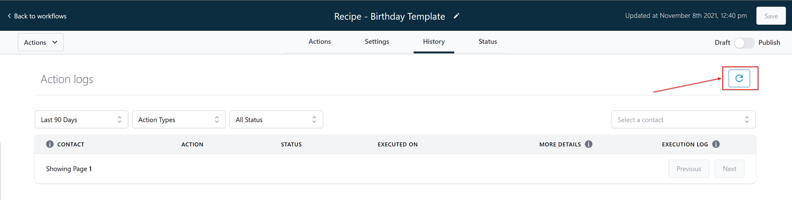 You can refresh the action log at any time by clicking this button.