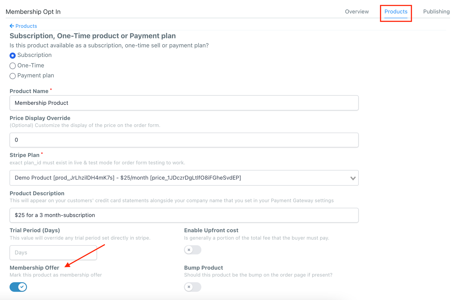 - If you already have a membership product, click on edit and scroll down and see if the “membership offer” option has been enabled.