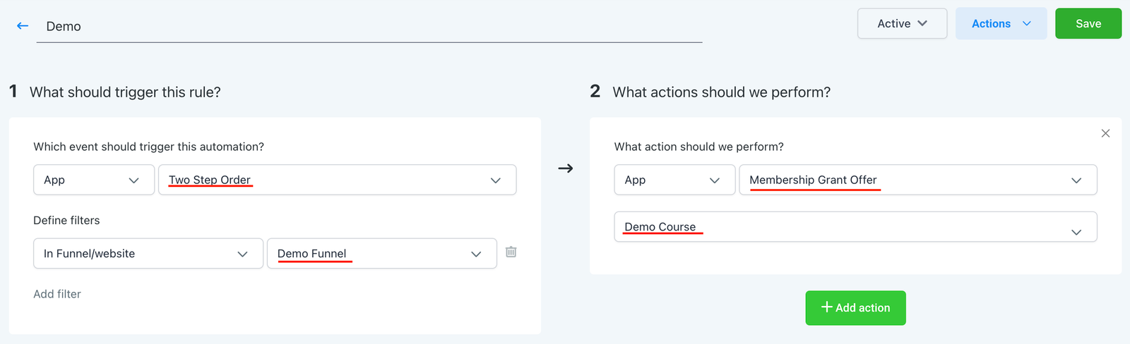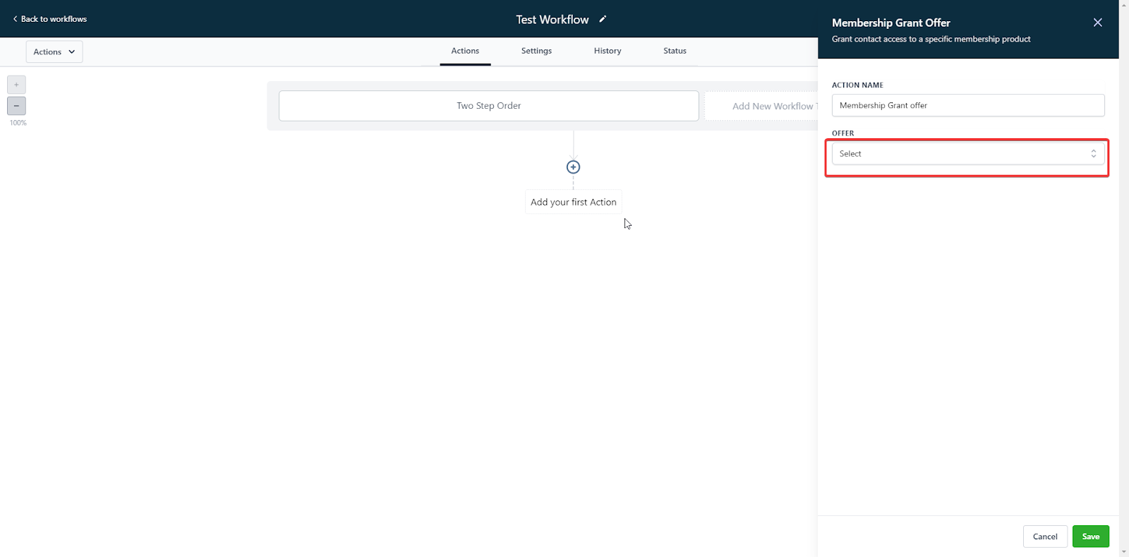 - Add an action and select “membership grant offer”