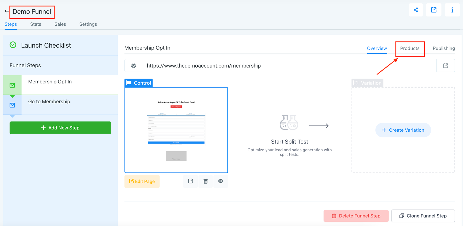 - Navigate back to the funnel overview and select or create a step following the purchase of the membership.