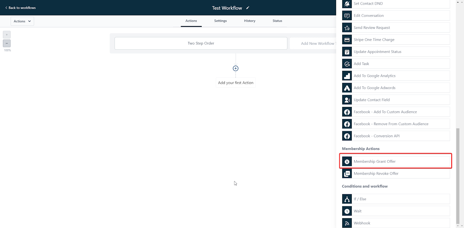 - Select the action “Membership Grant offer” and choose what offer to grant.