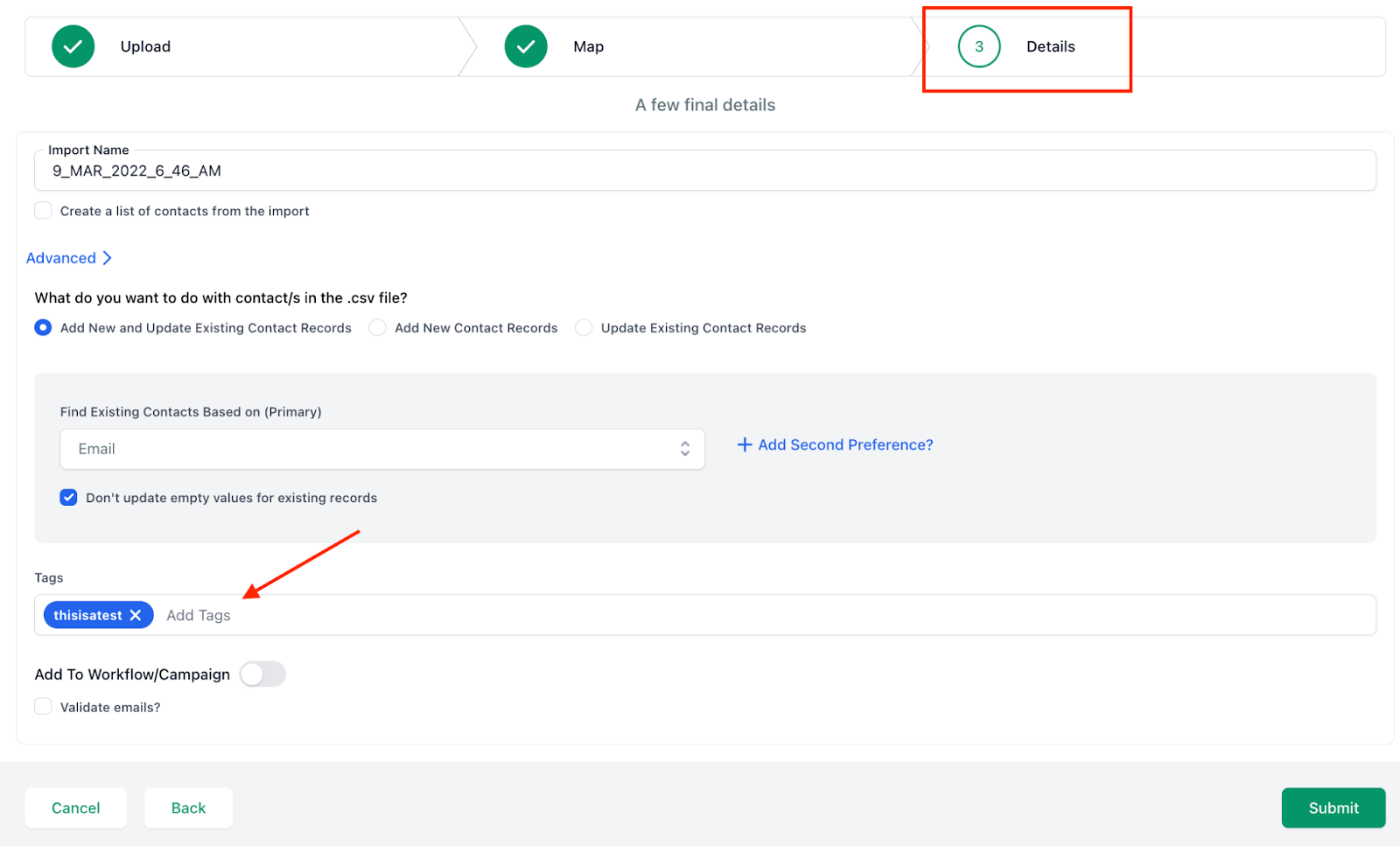 - You may add a new tag to the entire list being uploaded in Step 3 “Details” when importing contacts.