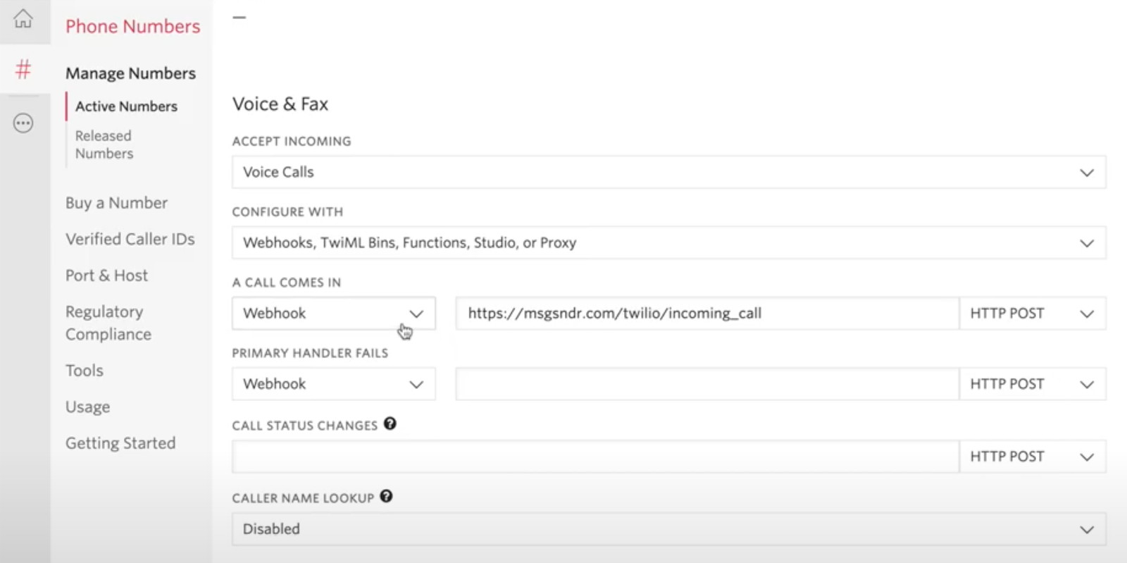 Step 2: Scroll down to the “Voice and Fax” section. Under when “a call comes in”, the default is a webhook that reads a default Twilio message. You can update this and change it to the TwiML Bin you just created. From the first dropdown, change to “TwiML Bin” and in the second dropdown, choose the name of your voicemail you set up.