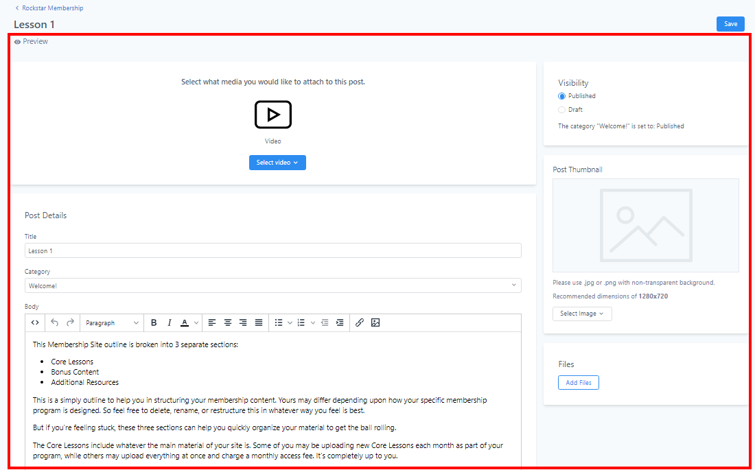 • Post Details: This section consists of the Lesson title, the Category the lesson belongs to, and the body of the lesson.
