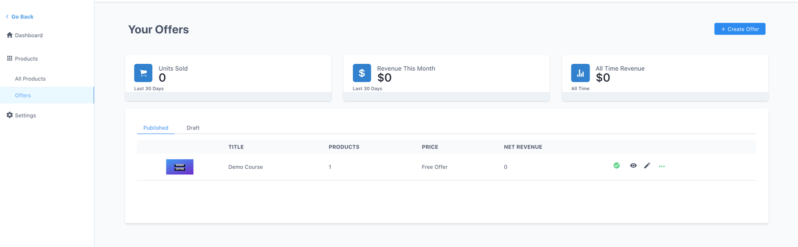 To access the membership editor area navigate to Funnels + Websites > Membership > Products > Offers > Create Offer. You’ll see a list of all your offers:
