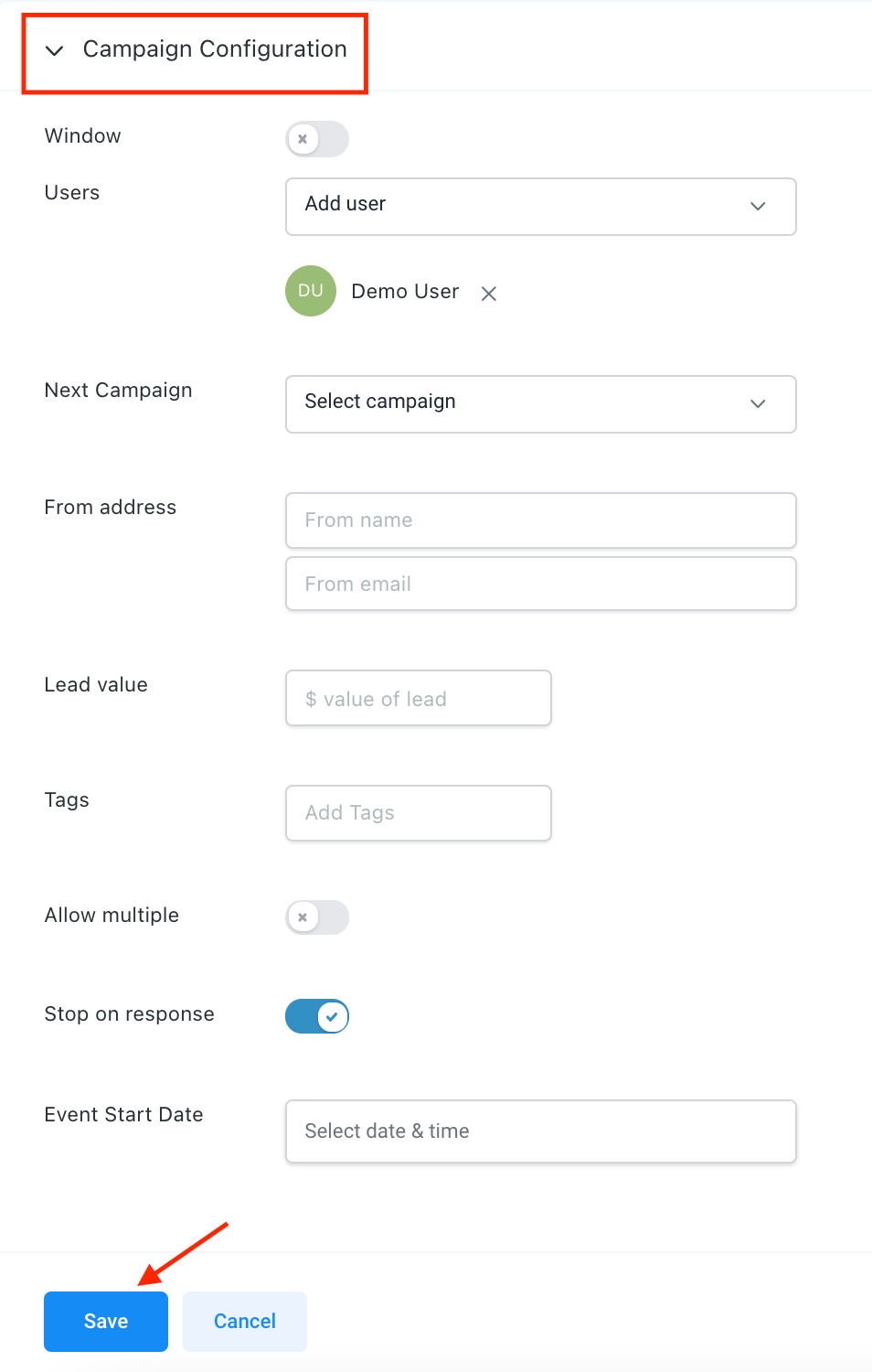 - Use the dropdown for “Campaign Configuration” to establish settings for the campaign. You can set up a window for campaign event delivery (such as Mon-Fri 8am-5pm), assign users within your system to a campaign, automatically determine what next campaign contacts/leads will go into, and more.