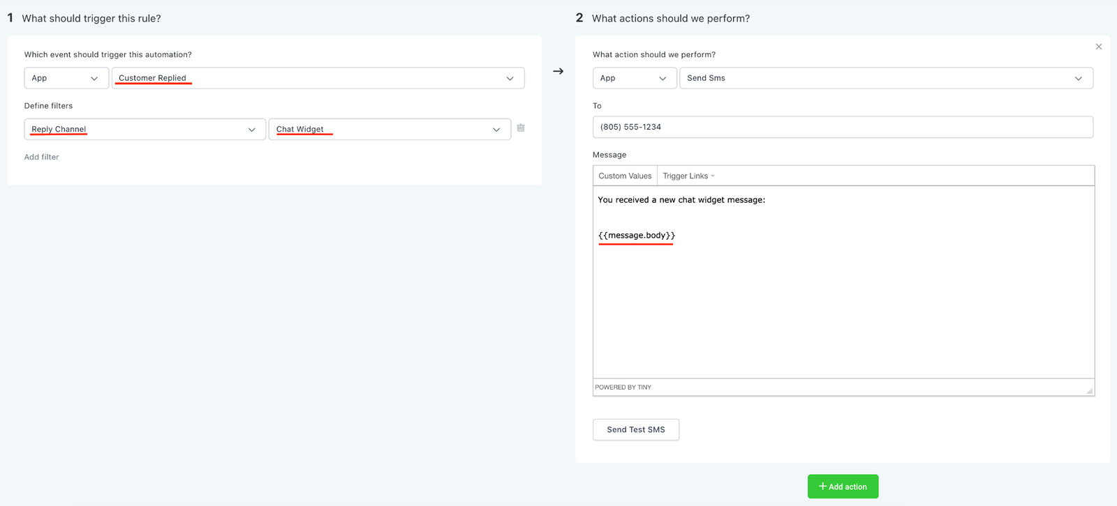 Step 3: For the trigger actions, use the “Message Body” custom value in a notification SMS or email. (The screenshot included uses a SMS for this example.) This custom value will display the chat widget message in the notification.