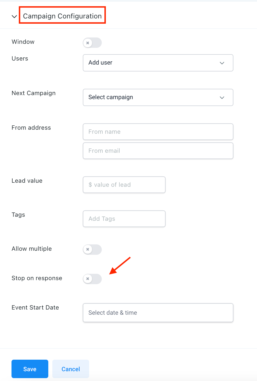 - To ensure that a lead continues to get reminders, even if they reply to the campaign, ensure that you toggle off the “Stop on response” in Campaign Configuration.