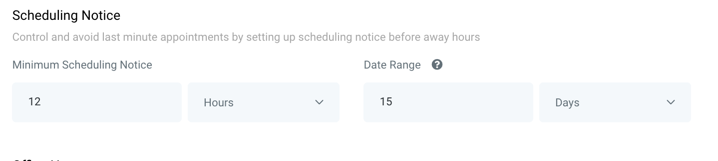 - Continue on to the Scheduling Notice section where you can set up the timeframe in which appointments can be booked. This can help prevent last-minute bookings, or bookings too far out.