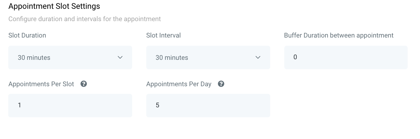 - Fill out the “Appointment Slot Settings” to configure the duration and intervals for appointments. Here you can customize how long an appointment slot is, if there’s a buffer of time between appointments, how many appointments can happen at once, and how many per day.