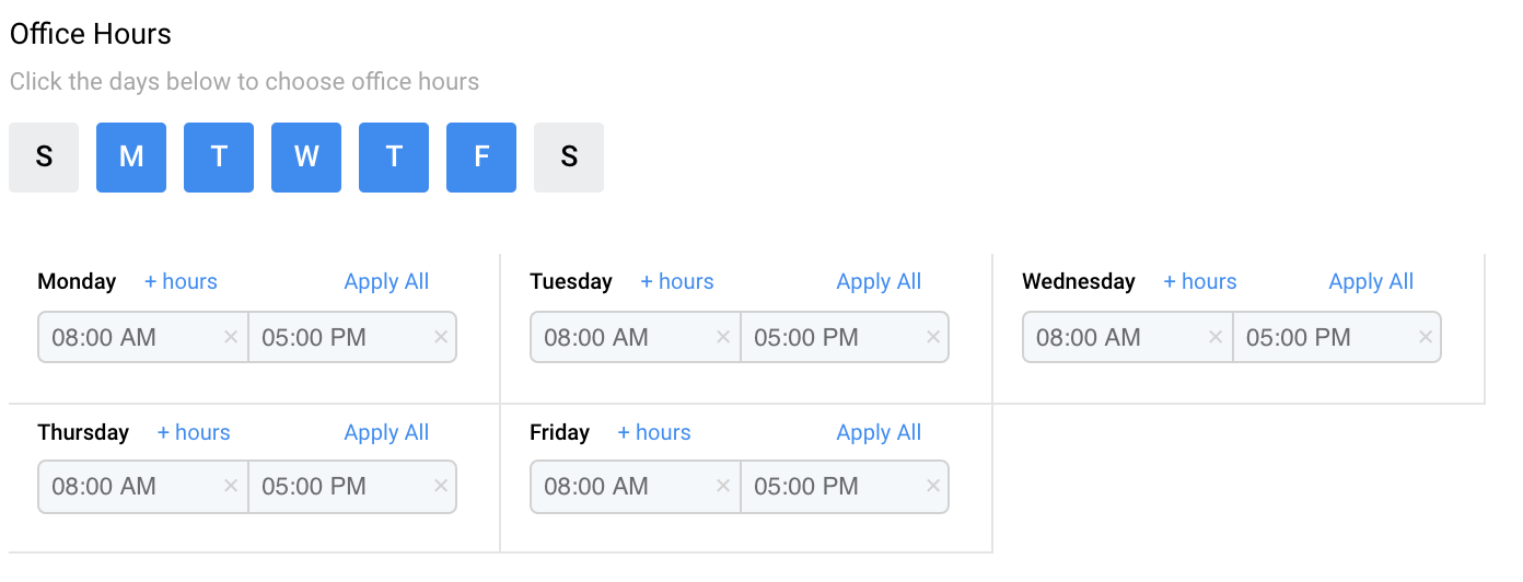 - Set your “Office Hours” by clicking On or Off the days of the week you wish to set hours for (blue means you have availability). Then, determine the hours for each day. Here we have Monday-Friday 8am-5pm set: