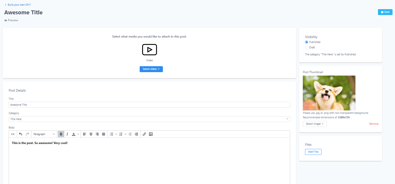 - In the new window, you give the post a title, add any attachments, insert body text, and add a thumbnail image.