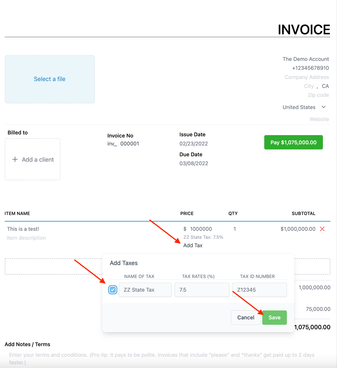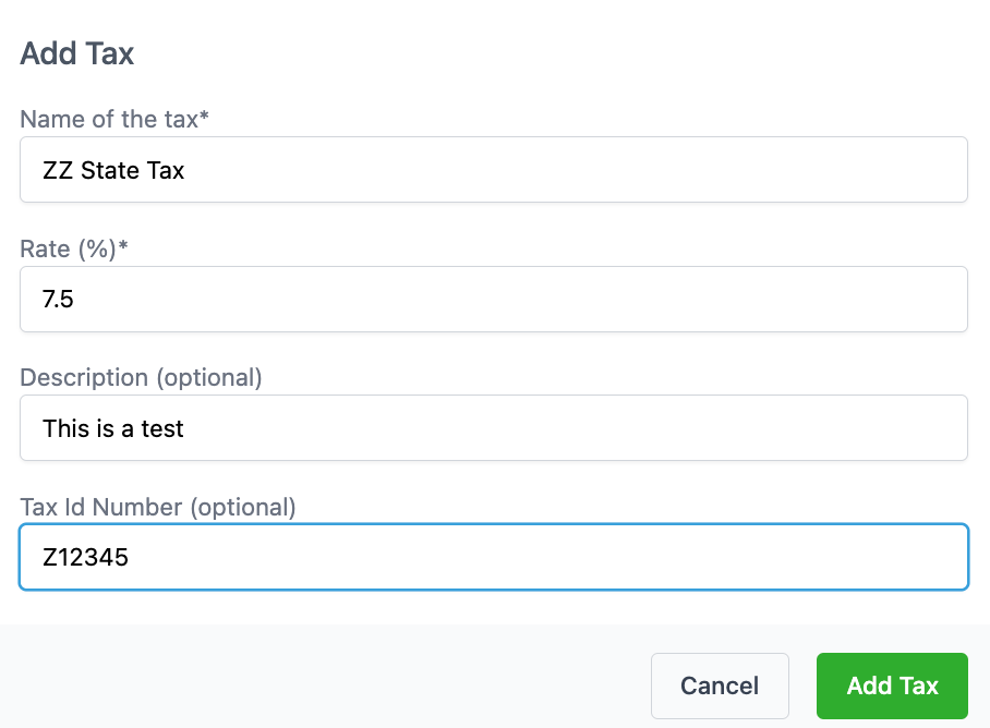 • Fill out the popup information. Name the tax, choose the percentage rate, and include an optional description and tax ID number.
