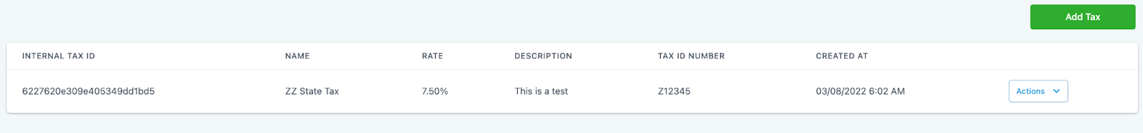 • Using the “Actions” dropdown on the right, you can delete a tax you wish to remove.