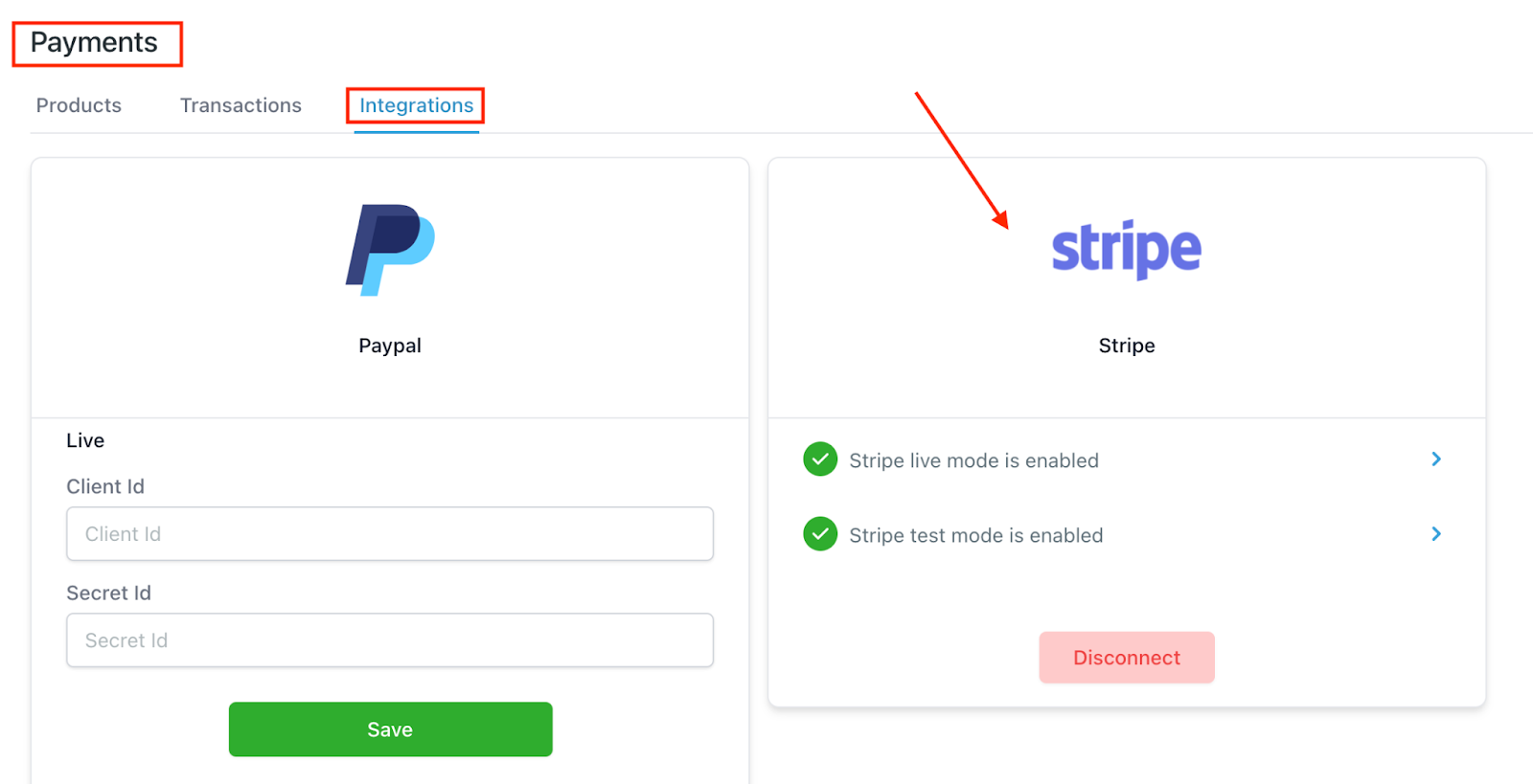 - Navigate to Payments > Integrations and ensure that your Stripe account is connected. (If not, follow our Stripe Integration tutorial to learn how.)