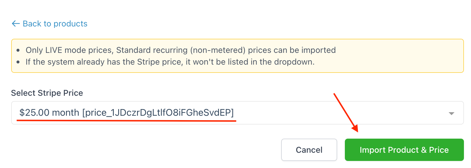 - NOTE: Only LIVE mode prices can be imported. Also, if the system already has the Stripe price, it won’t appear in the import dropdown.