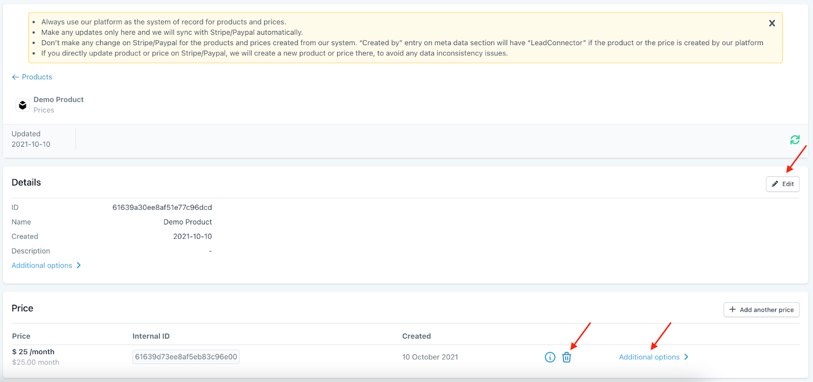 - You’ll be redirected to a view of the newly imported product. You can view the details, add another price, edit the product, or delete the product.