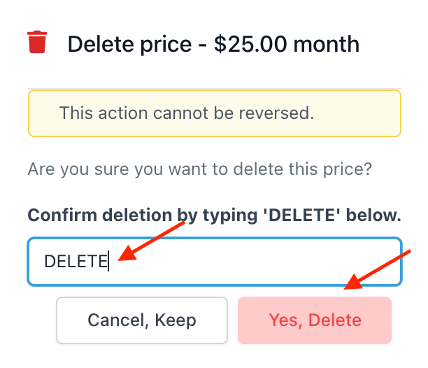 - NOTE: If you click the trashcan icon to delete the product, a popup window will appear and you’ll need to type in DELETE to confirm you wish to proceed, as the action cannot be undone.