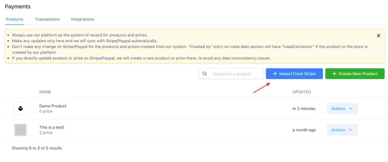 - Under Payments > Products you’ll see a blue “Import from Stripe” button.