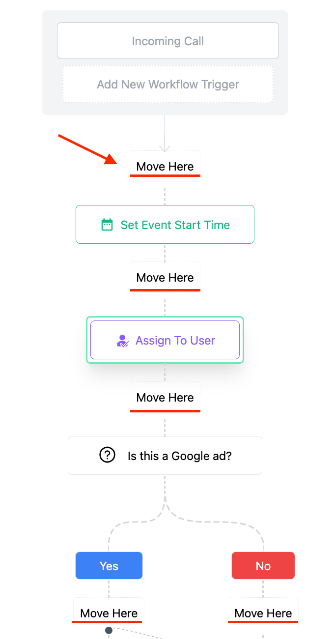 • The Workflow will now display “Move Here” icons. Click any of them to move the Workflow action(s) to that spot.