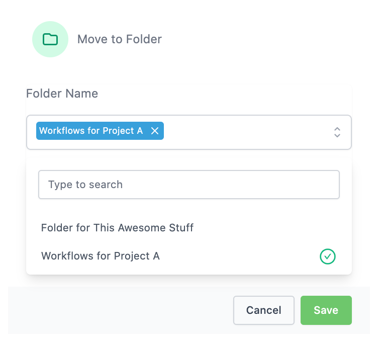 NOTEYou can move a Workflow out of one folder into the general page, or into another folder, following the same process. You can also navigate into a folder and create a Workflow from within the folder to automatically have it saved within that folder.