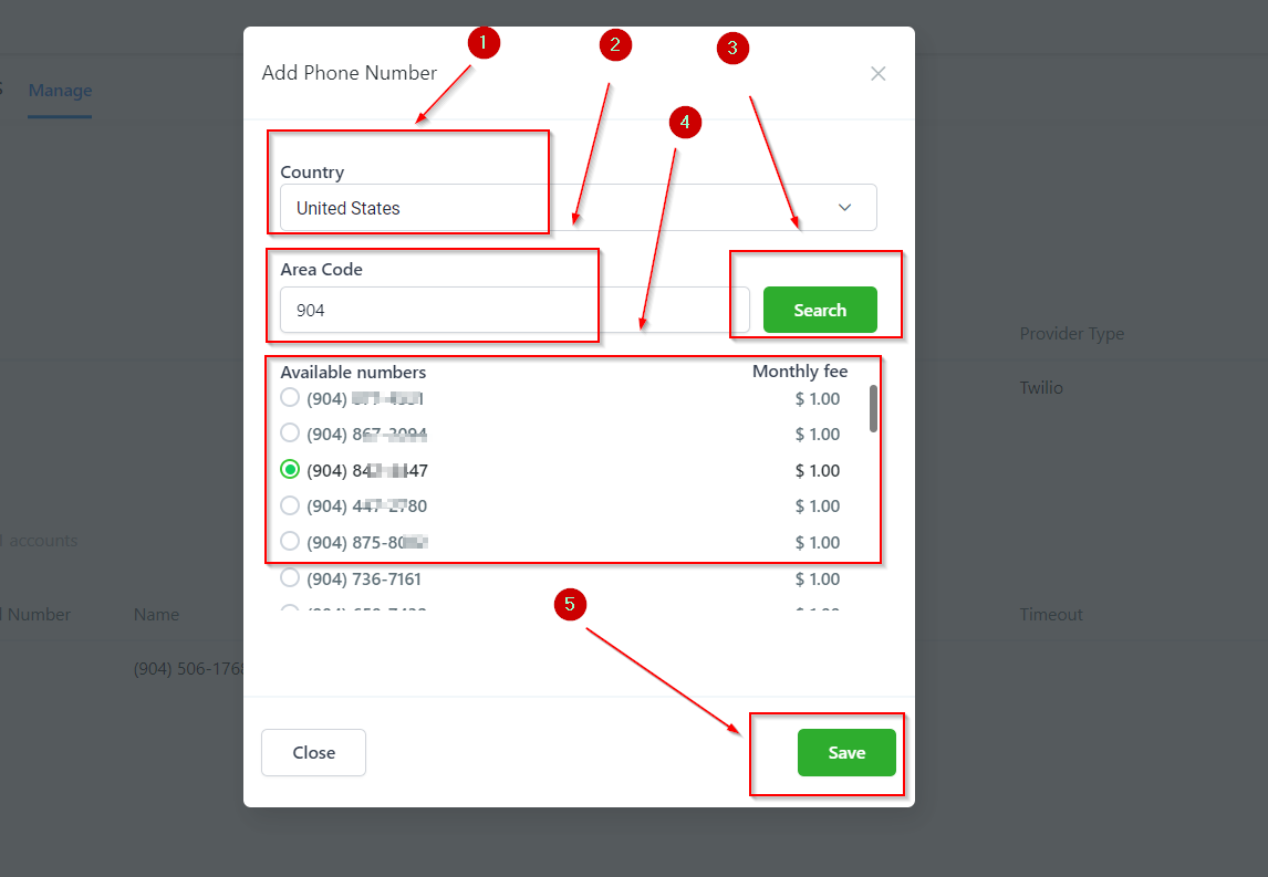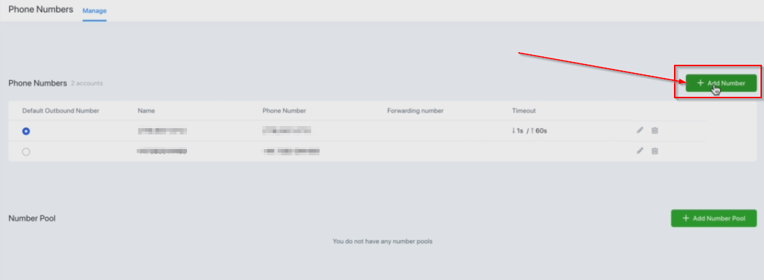 Lets you add a new phone number for your CRM location. Click the + Add Number button to begin adding new numbers to your account.