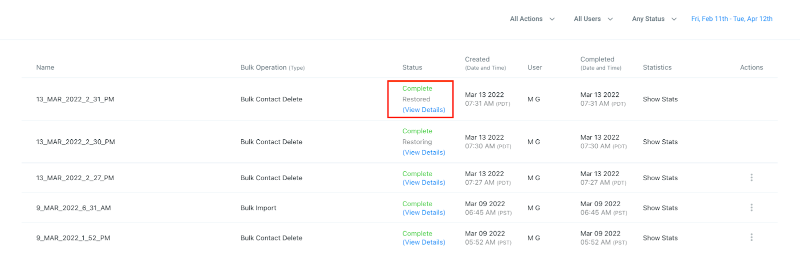 Bulk Action – Restoring Contacts: This option is used for restoring contacts that were deleted in bulk.