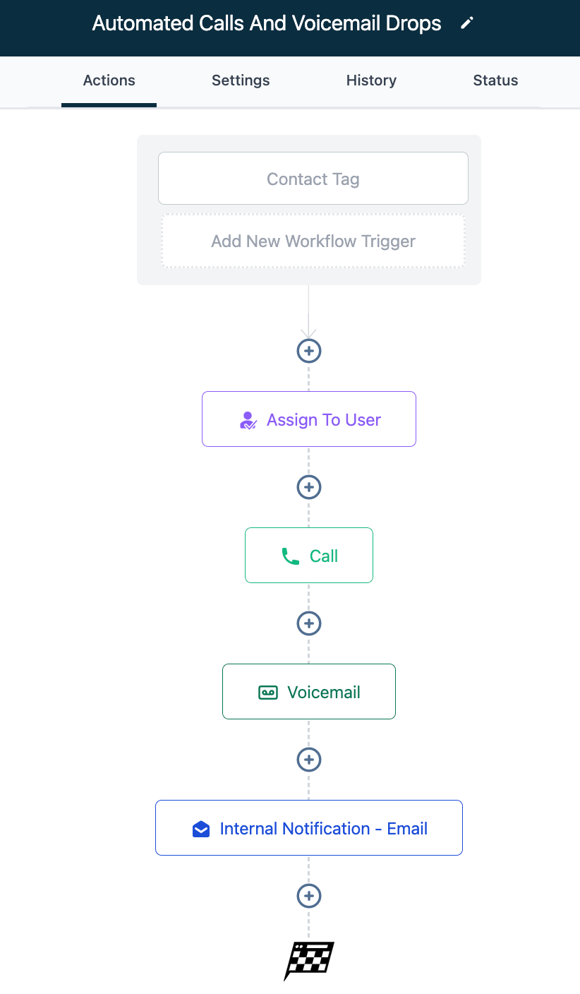 Within the Workflow builder, you may want to setup an automated sequence of calls and voicemail drops. Here’s a sample Workflow showing you how you can create this based on a tag.