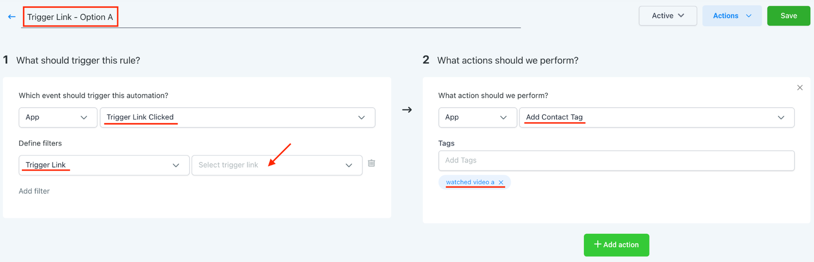 • Define the filters as Trigger Link, and specify which trigger link you want this action applied for. (In the example below we’re using the video trigger link to tag contacts with the “Watched Video A” tag to track video views.)