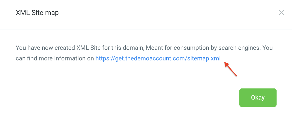 - A new popup window will appear. Click into the link which will direct you to a page where you can view the code of your new SiteMap.