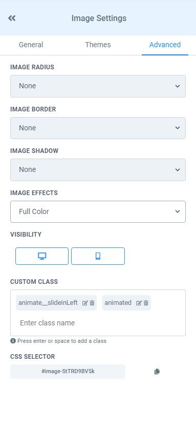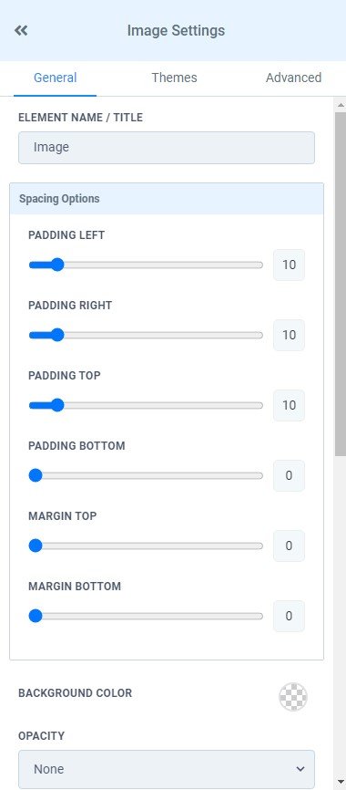 Within the funnel builder, once you’ve added an image, you’ll see “Image Settings” on the left side of the screen. There are 3 tabs – General, Themes, and Advanced. Toggle between the three sections of settings to customize the image as you wish.