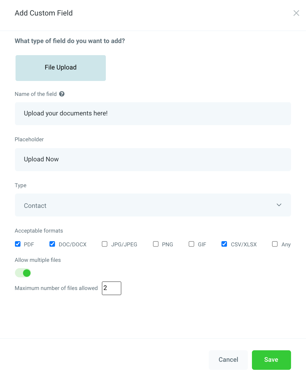 - Fill out the popup window to customize your new custom field. Name the field, add a placeholder, choose acceptable file format(s), and toggle on/off the “allow multiple”.