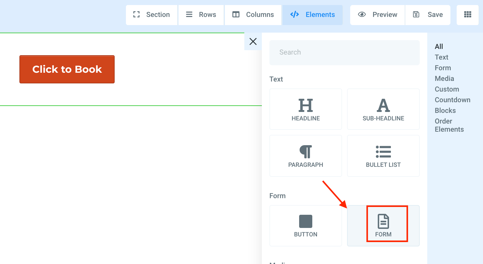 • Once you’ve created a form, survey, or calendar that you wish to use, you’ll be able to add it in the Funnel Builder as an “Element” of the funnel page.