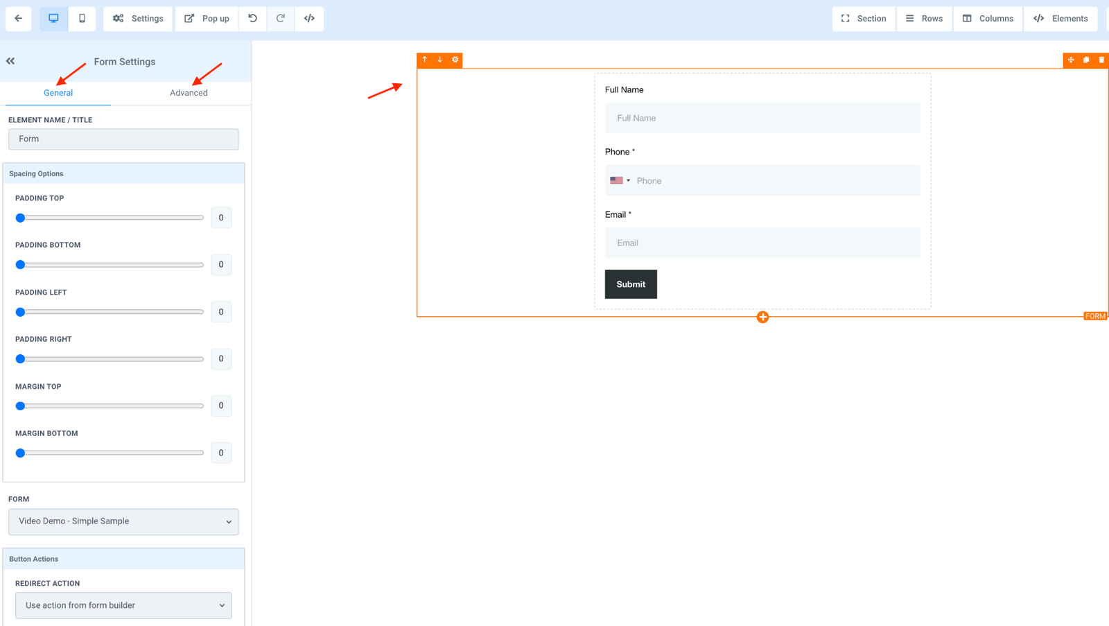 • For Forms, you’ll see general spacing options, the form selector where you can choose which Form (if you have multiple in your system) appears, redirect action, and more.