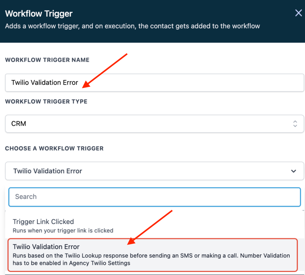 - Add a Workflow Trigger, and choose “Twilio Validation Error” from the dropdown list.