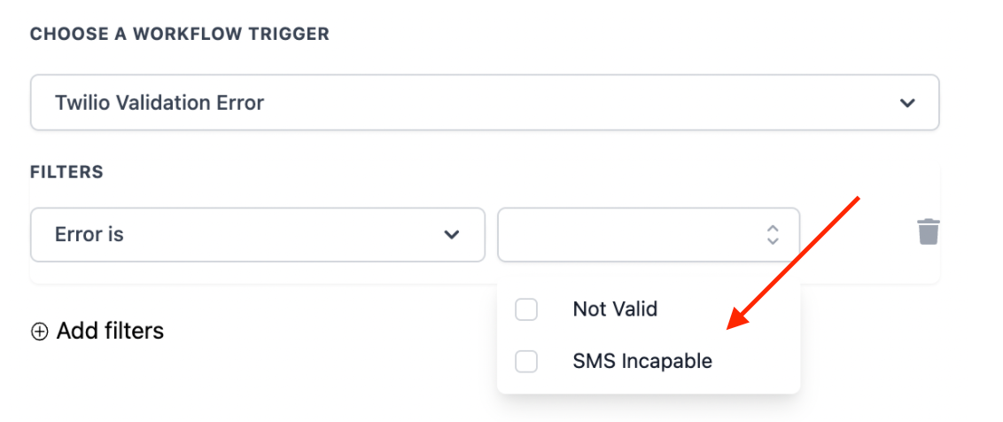 - Choose your filter(s). The filter can operate based on the error when the phone number is invalid (Error 21211) or SMS is incapable (error 30006). Check the box for the option(s) you wish to use.
