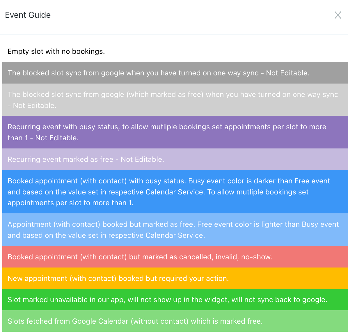 - By clicking on the ? icon, you can view the Event Guide, or legend, to understand the various color codes for different types of appointments/events in your calendars.
