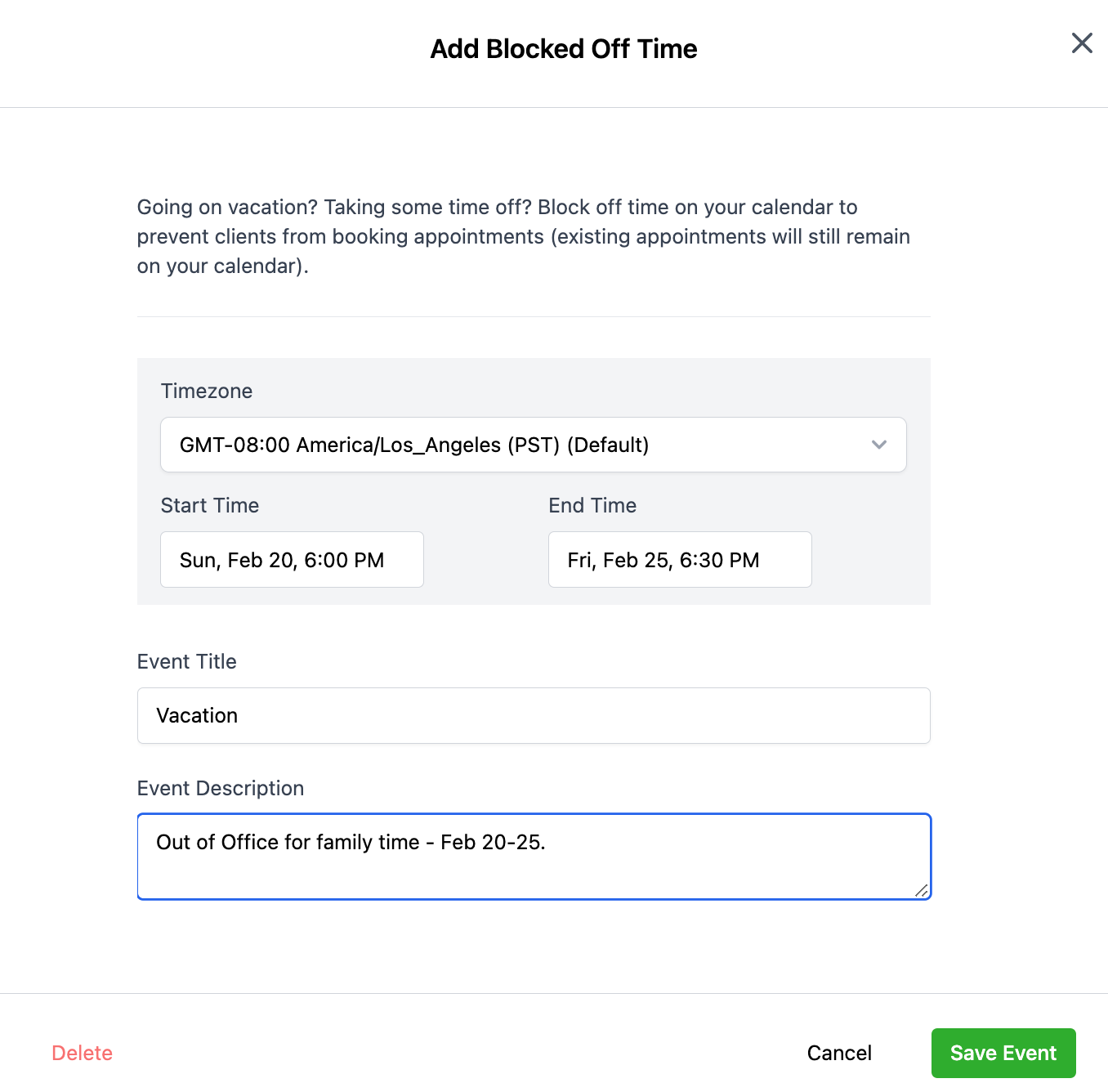 - Fill out the details including timezone, days/times you wish to block off, and a title and description.