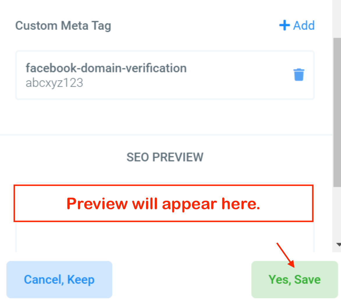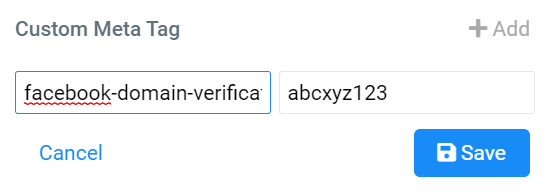 • Copy the Meta Tag provided by Facebook. It should look something like this, for example: <meta name=”facebook-domain-verification” content=”abcxyz123″ />