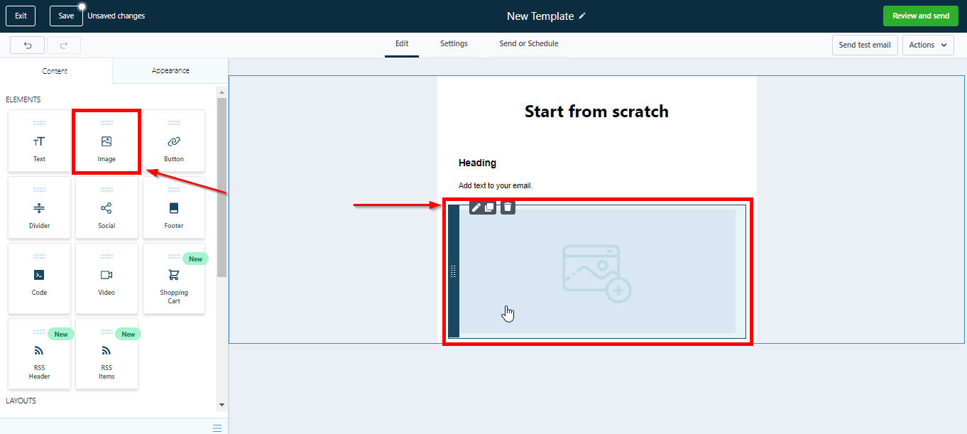 In the Image element, you will be able to add images for your emails. Simply drag and drop the Image element from the left sidebar to the body of the email as shown in the image above.