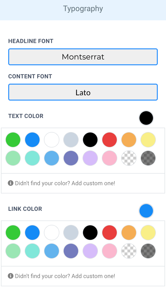 To make sure all fonts chosen are consistent throughout the funnel, use the Typography tab under the Overall Funnel Settings to choose the native Headline and Content fonts that will be used throughout the funnel.