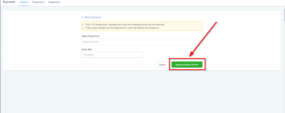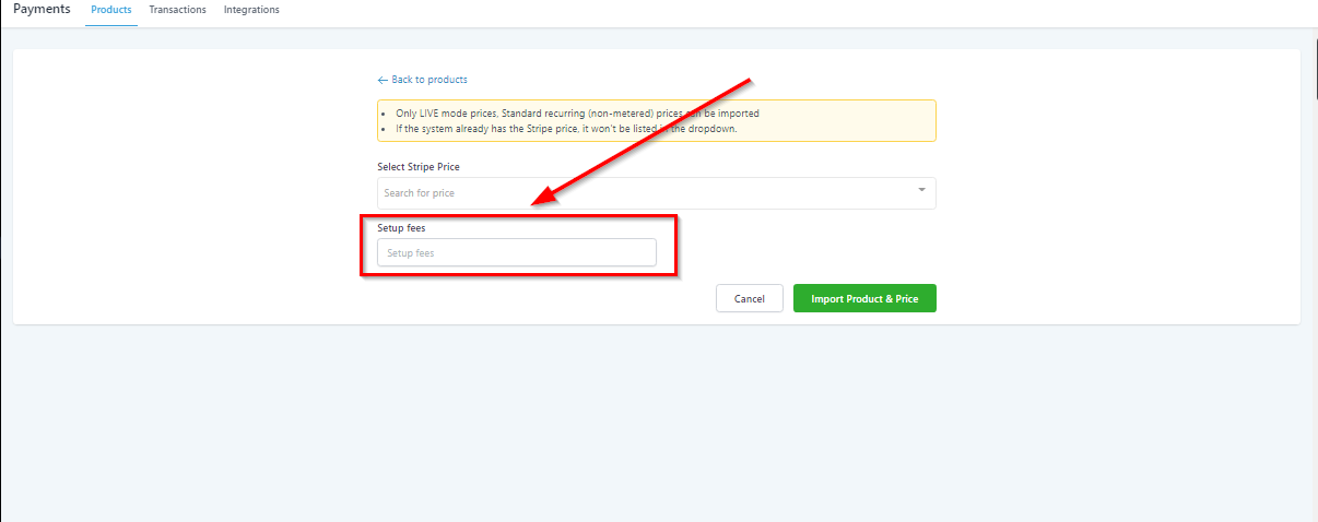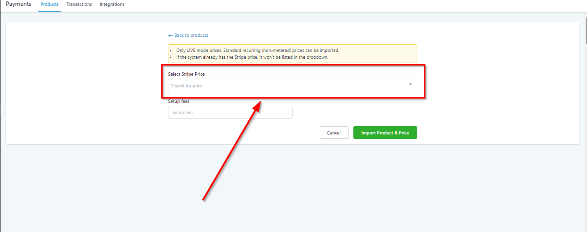 • If the system already has the Stripe price, it won’t be listed in the dropdown.