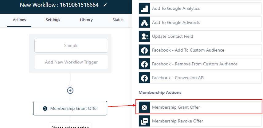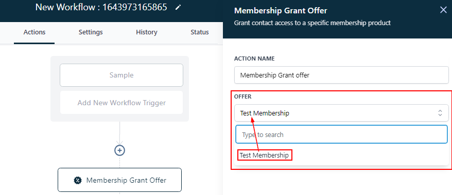 Select the membership offer you want to grant contact access to in this workflow.