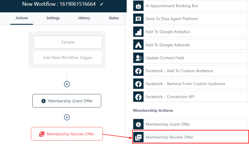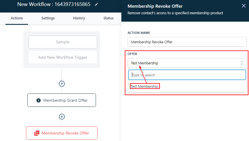 Select the membership offer you want to revoke contact access to in this workflow.