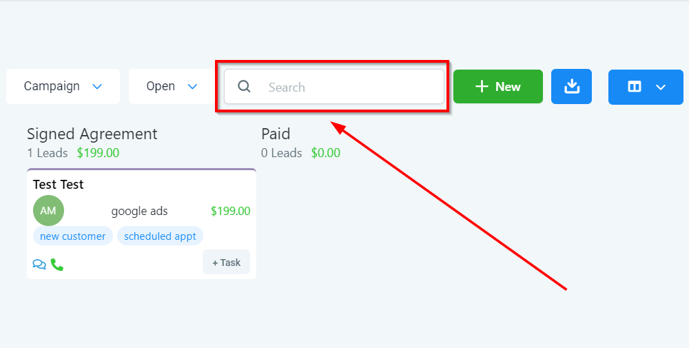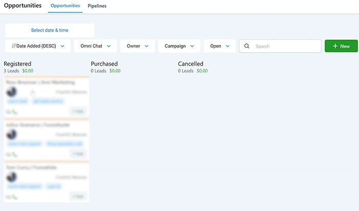This is an overview of your opportunities tab. In this section, you will be able to organize new opportunities into pipelines and keep track of them throughout the entire sales cycle.