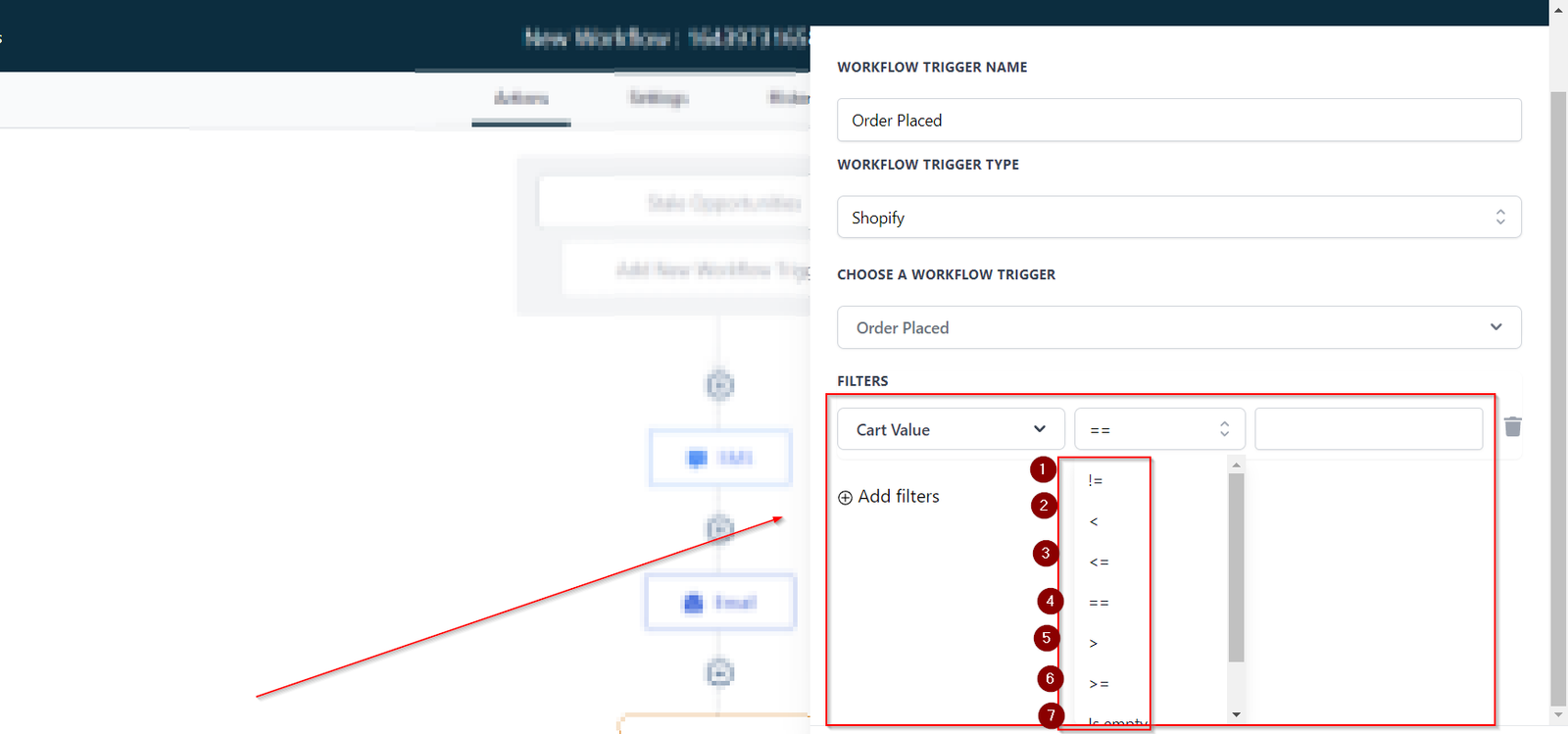 This filter will allow you to select the cart value with additional customizations. The trigger will get activated when you have provided specific instructions such as – cart value “is greater than” $500. below is how to interpret the symbols in your CRM.