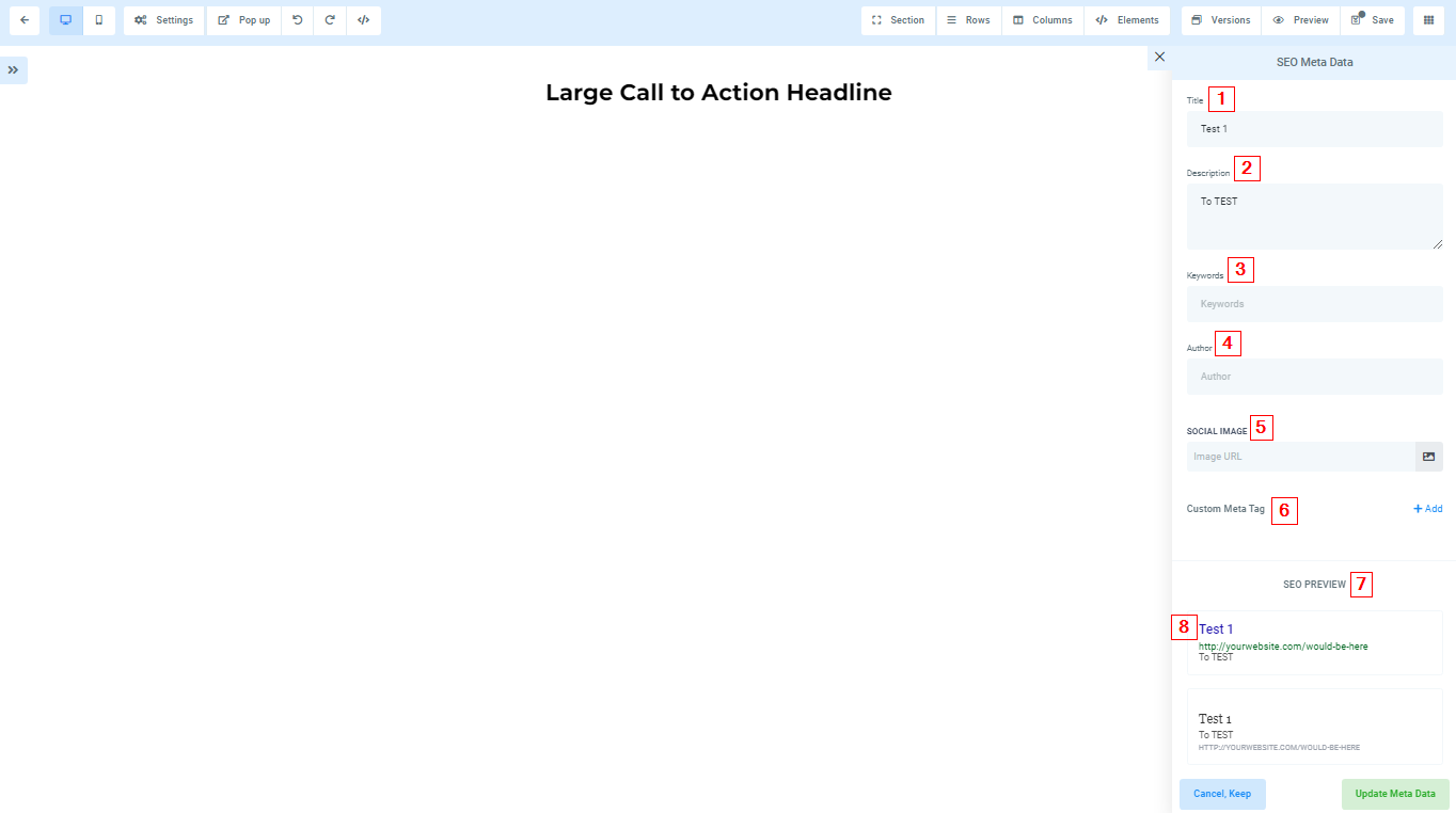 Custom Meta TagYou can customize Meta tags for your page by clicking on the “+All” button, and inputting the tag’s name and content.