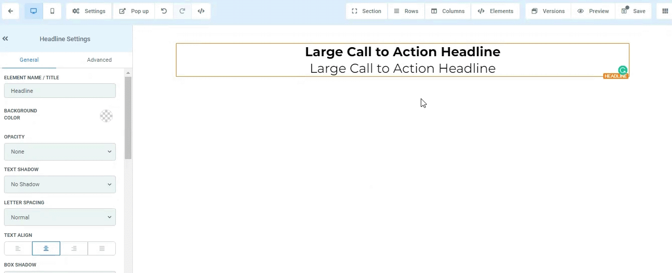 This is the Editor’s section of a Funnel/ Website that allows you to create and edit your page. So you have a couple of different options here to work with; the Section, Row, Column, and Element. These edit options are distinguished by their colors; Section – GREEN, Row – BLUE, Columns – LILAC, and Element – ORANGE.