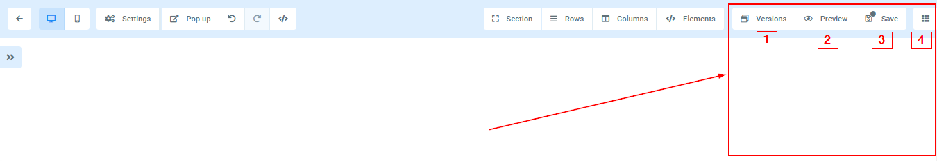 In the upper right corner of the page, you can review previous changes made by clicking on the “Version” button. Next to it is the “Preview” button, by clicking on it, you can view how your funnel looks when it’s on the web. You also have the “Save” button, always save your changes to avoid losing them. The last icon on the right corner is the “Funnel Page Filter”, you can shuffle between the funnel pages you created by clicking on it.