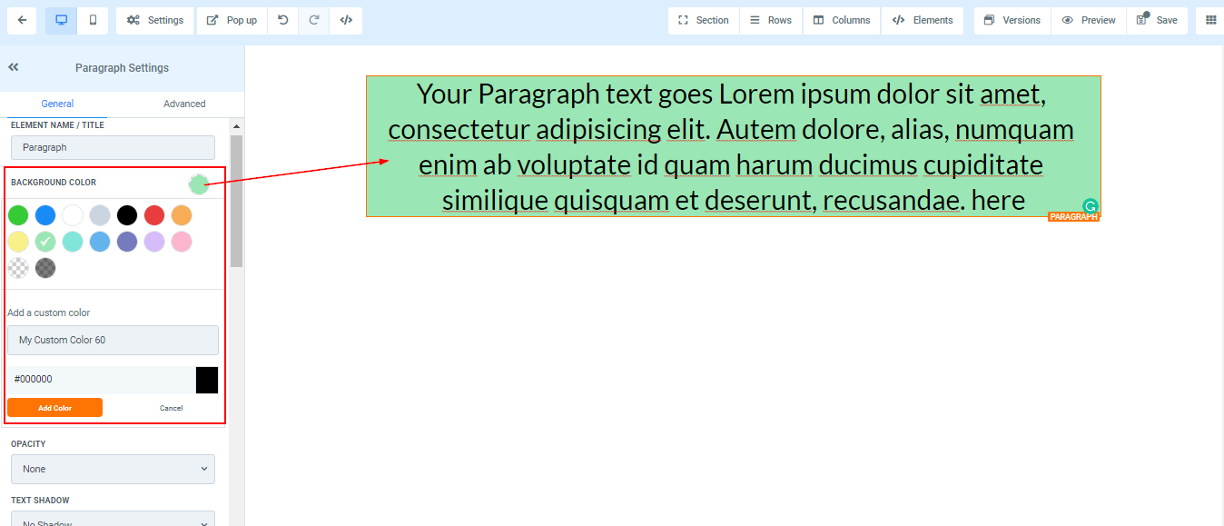 If you want to change the background color of your Paragraph you can do that by clicking on the content you want to adjust its background**.**